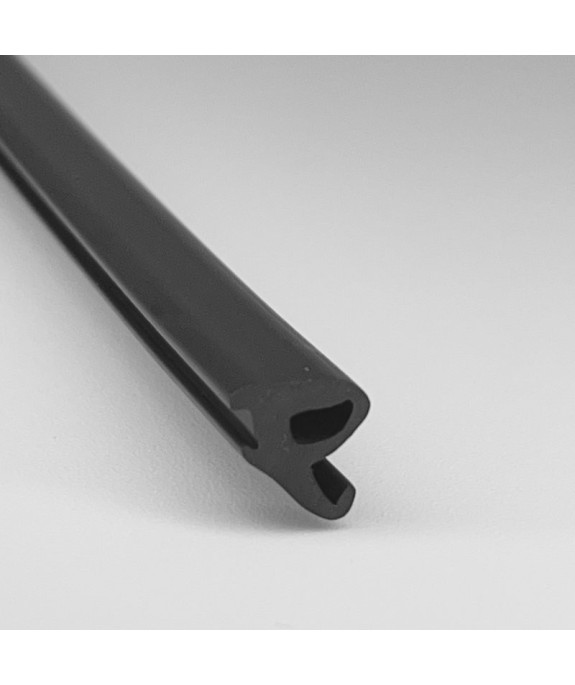 Ce profilé est réalisé en Caoutchouc élastomère souple de dureté 65shA. le profilé s'enfonce dans le jeu à combler entre la vitre et le châssis. La forme de ce profilé permet de compenser un jeu entre le châssis et la vitre de 6 à 7 mm.