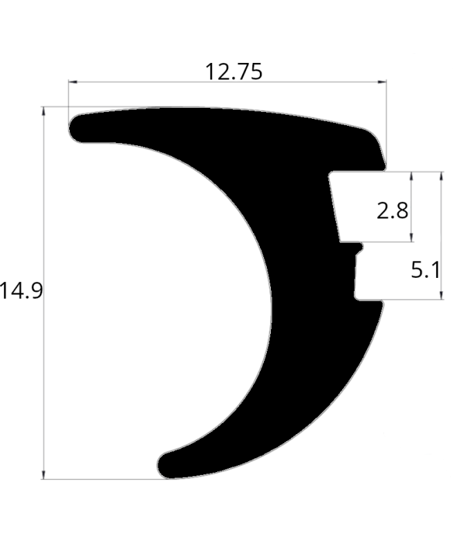 Ce profilé est réalisé en Caoutchouc élastomère souple de dureté 65shA. Il est utilisé pour le maintien et l'étanchéité d'une vitre ou d'un panneau dans un châssis en aluminium. le profilé s'enfonce dans le jeu à combler entre la vitre et le châssis. La forme de ce profilé permet de compenser un jeu entre le châssis et la vitre de à mm.