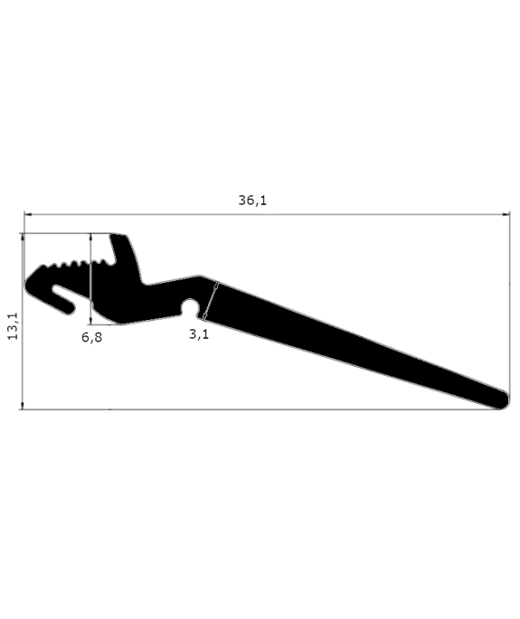 Ce profilé est réalisé en Caoutchouc élastomère souple de dureté 65shA. Ce profilé est utilisé pour verrouiller des vitres ou panneaux sur un profilé aluminium.La lèvre se soulève pour venir en appuis sur le vitrage. Le talon de fixation est à enfoncer dans la rainure du profilé aluminium, permettant ainsi le verrouillage de l'ensemble et de réaliser l'étanchéité.