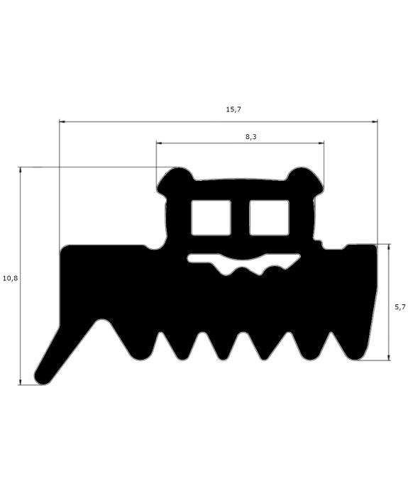 Ce profilé est réalisé en Caoutchouc élastomère souple de dureté 65shA. Ce profilé est utilisé pour verrouiller des vitres ou panneaux sur un profilé aluminium. Les lèvres s’écartent pour venir en appuis sur les vitres. Le talon centrale en forme de flèche se clipse dans la rainure du profilé aluminium, permettant ainsi le verrouillage de l'ensemble et de réaliser l'étanchéité.