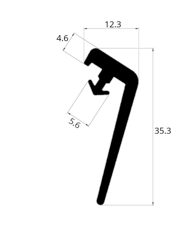 Ce profilé est réalisé en Caoutchouc élastomère souple de dureté 65shA. Ce profilé est utilisé pour verrouiller des vitres ou panneaux sur un profilé aluminium.La lèvre se soulève pour venir en appuis sur le vitrage. Le talon de fixation est à enfoncer dans la rainure du profilé aluminium, permettant ainsi le verrouillage de l'ensemble et de réaliser l'étanchéité.