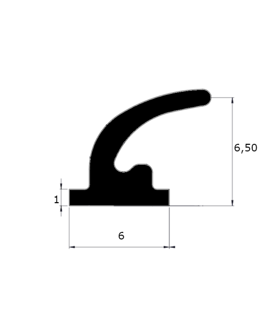 Ce profilé est réalisé en Caoutchouc élastomère souple de dureté 65shA. Ce profilé est utilisé pour faire étanchéité sur un profilé aluminium. La lèvre s'écrase lors de la fermeture de la porte ou de la fenêtre. Le talon centrale se glisse dans la rainure du profilé aluminium, permettant ainsi de réaliser une étanchéité parfaite.